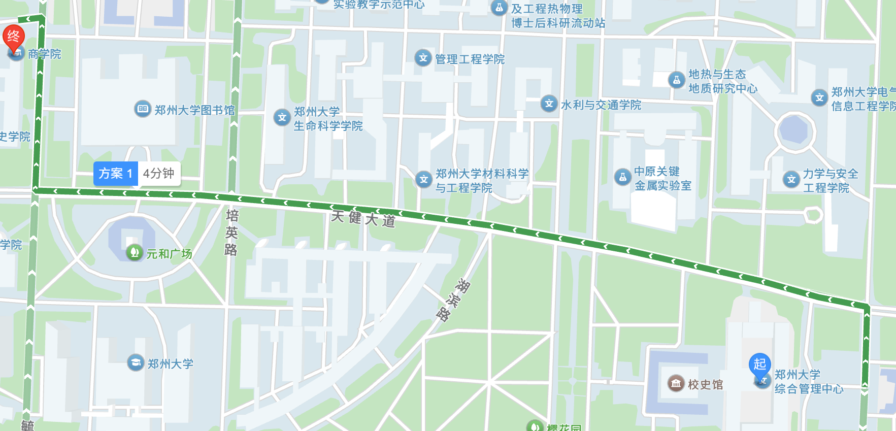 (由郑州大学综合管理中心出发,到郑州大学商学院).